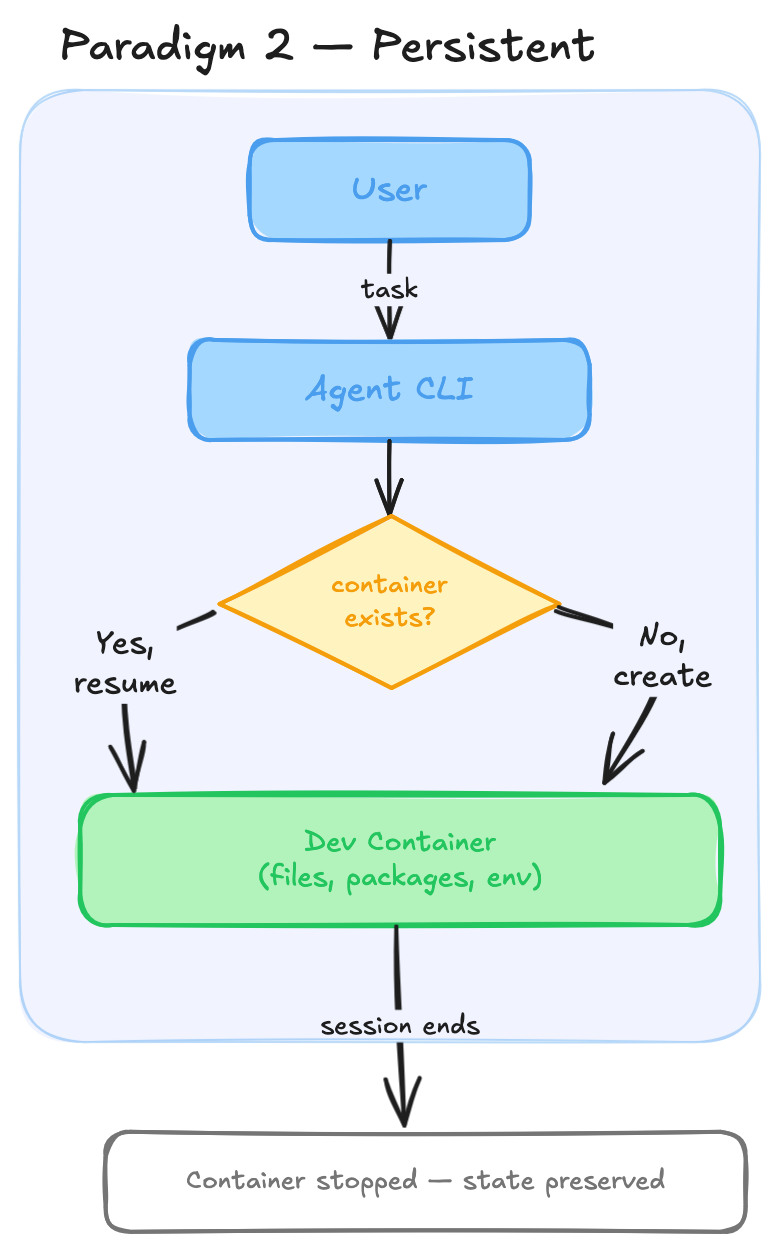 Paradigm one involves starting the agent CLI inside a freshly created Docker container. The container uses a generic base image that isn’t project-specific, so you have to set up the workspace when starting out. You start an interactive environment, talk to the agent, build some stuff, and when the task is done you exit, and the Docker container is destroyed.