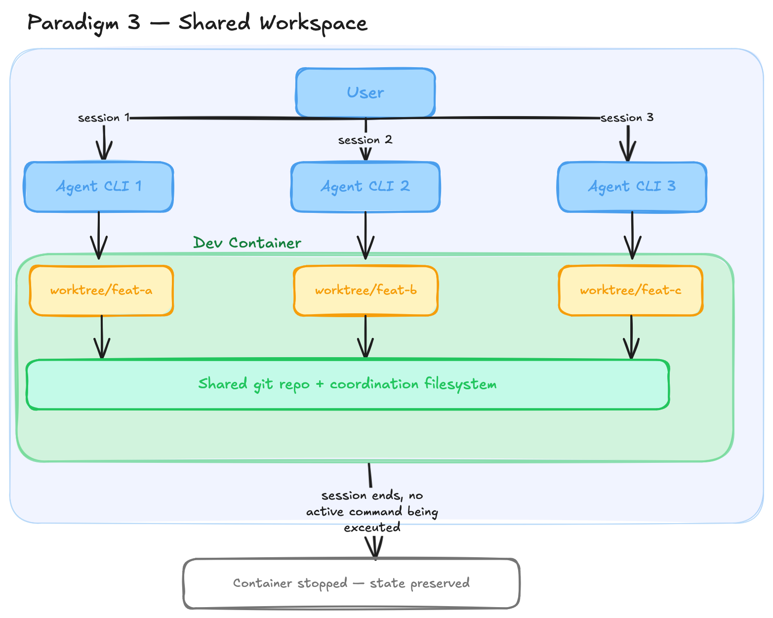 For paradigm two, look at a good idea that already exists: dev containers in VS Code. When you develop inside a dev container, the container isn’t destroyed once you exit the editing session. It persists in a stopped state and can be resumed when you start developing again. The workspace you establish remains intact with all your changes. The next evolution from paradigm one, then, is to use persistent dev containers so you don’t have to recreate workspaces again and again. Something similar is being done with claude agent teams right now.